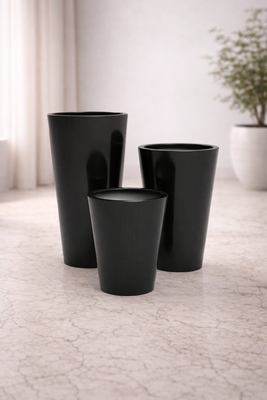 3’lü Siyah Fiber Saksı Seti – Modern Dekoratif İç Mekan Saksıları