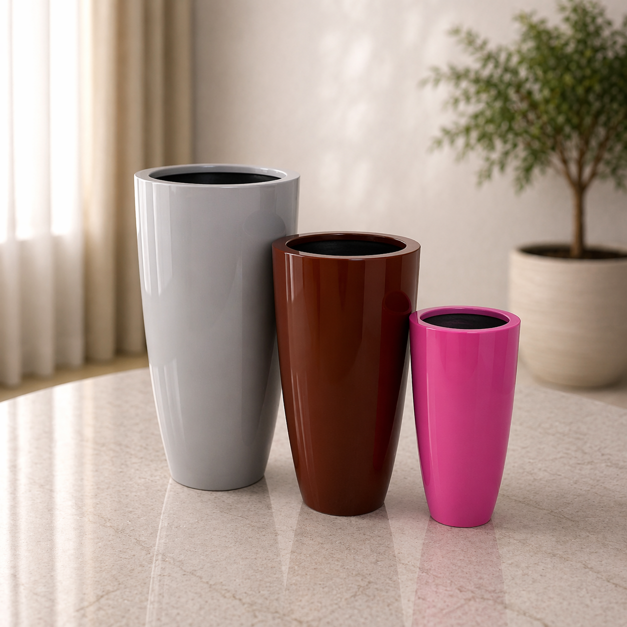 3’lü Uzun Fiber Saksı Seti – Modern Dekoratif İç Mekan Saksıları